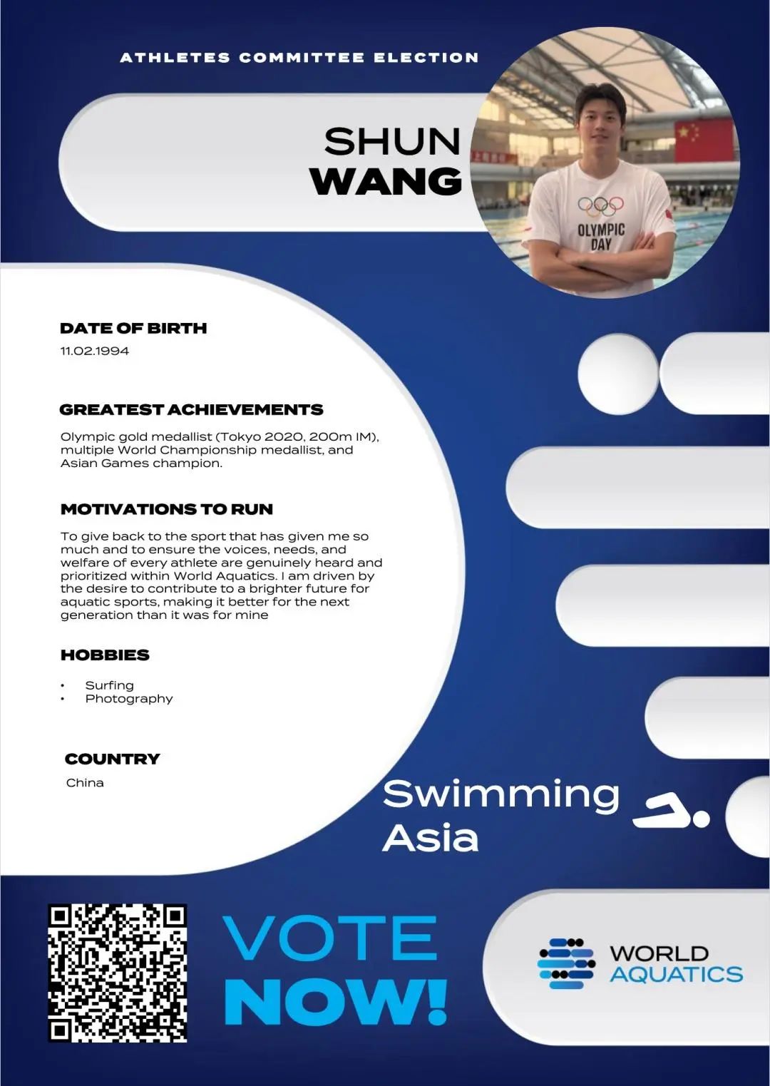 此前据央视体育音书,汪顺成为宇宙泳联畅通员委员会候选东说念主。投票本领为7月5日至28日,仅限2025年新加坡世锦赛注册畅通员们参与投票。每个大洲各选出一男一女两名畅通员,拍浮名堂一共选出10位委员。